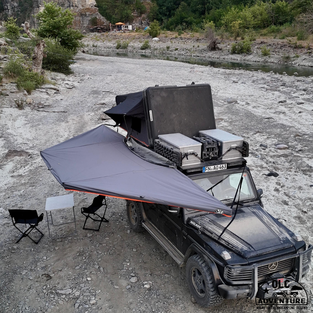 Unsere 180° Markise verfügt in der 2,1 m Variante seitlich am Fahrzeug gute 8 m² Schatten und Wetterschutz.