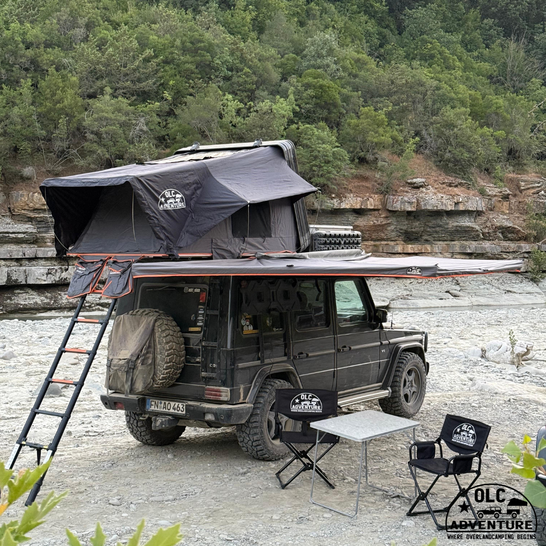 Die freitragende 180° Markise von OLC Adventure ist innerhalb weniger Minuten komplett aufgebaut. Sie zeichnet sich durch eine durchdachte, leichte und trotzdem sehr stabile Konstruktion aus. Jeder Arm der Markise hat seinen eigenen Drehpunkt und ist durch die verschweißte, doppelte 4 Kant-Aluminiumrohr Konstruktion im A-Design enorm belastbar. Die Teleskopstütze helfen bei windigem Wetter die Markise am Boden zu befestigen. Sollte es etwas mehr auffrischen, können die 4 Teleskopstangen im Handumdrehen am Boden verankert werden. 4 signalfarbene Abspannbänder und Heringe geben der Markise dabei guten Halt. Zwischen den Armen lässt sich die Markise nochmals abspannen, damit das Regenwasser auch sicher seinen Ablauf hat. Der Stoff besteht aus einem 600D Polyesterstoff, welcher leicht und trotzdem sehr belastbar ist. Er verfügt über einen UV-50 Sonnenschutz, ist tauchimprägniert und von unten PU beschichtet.