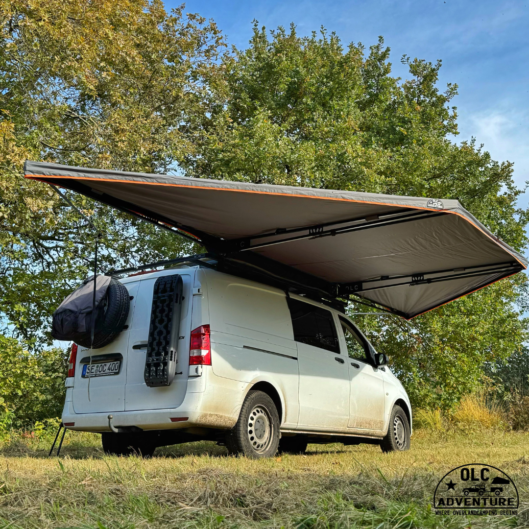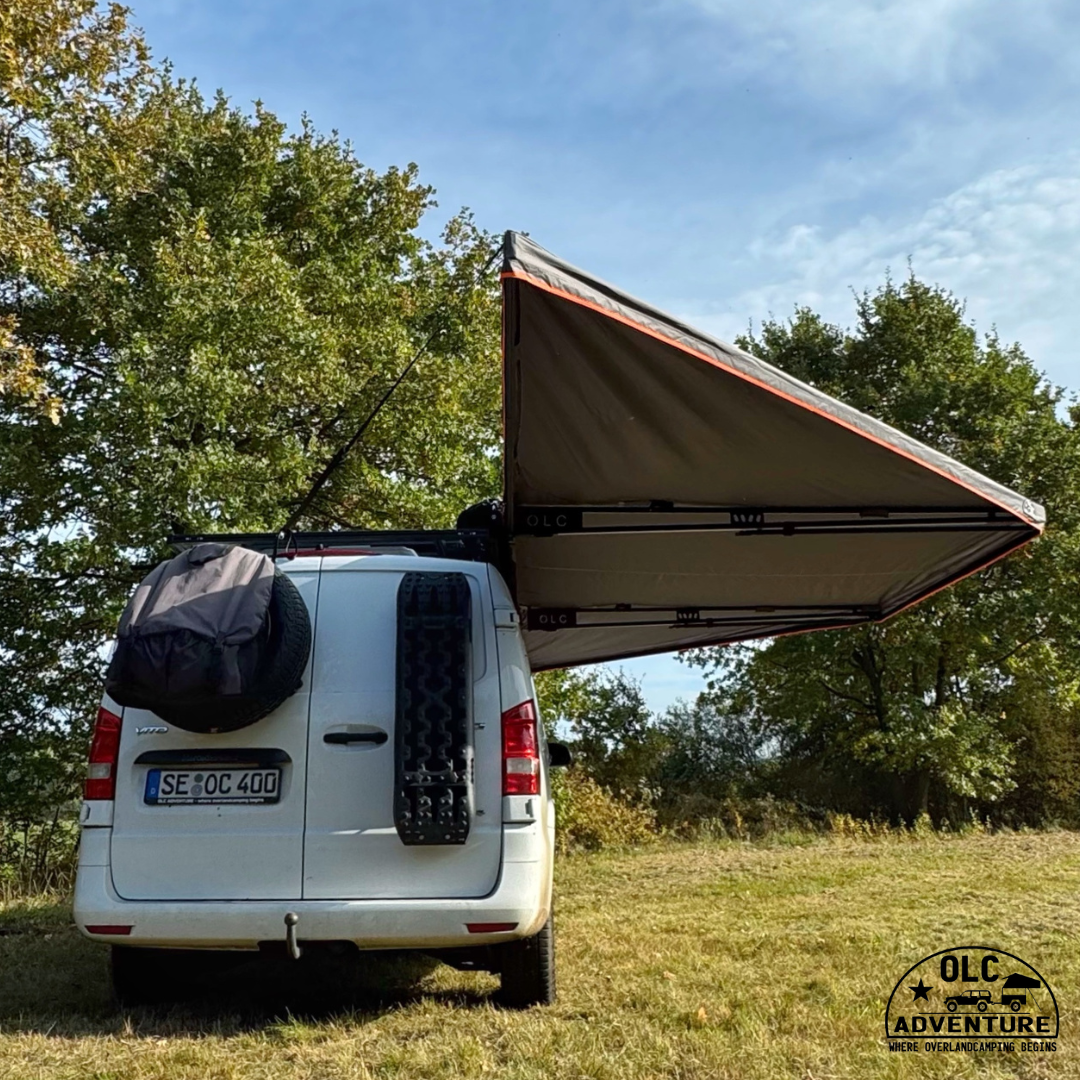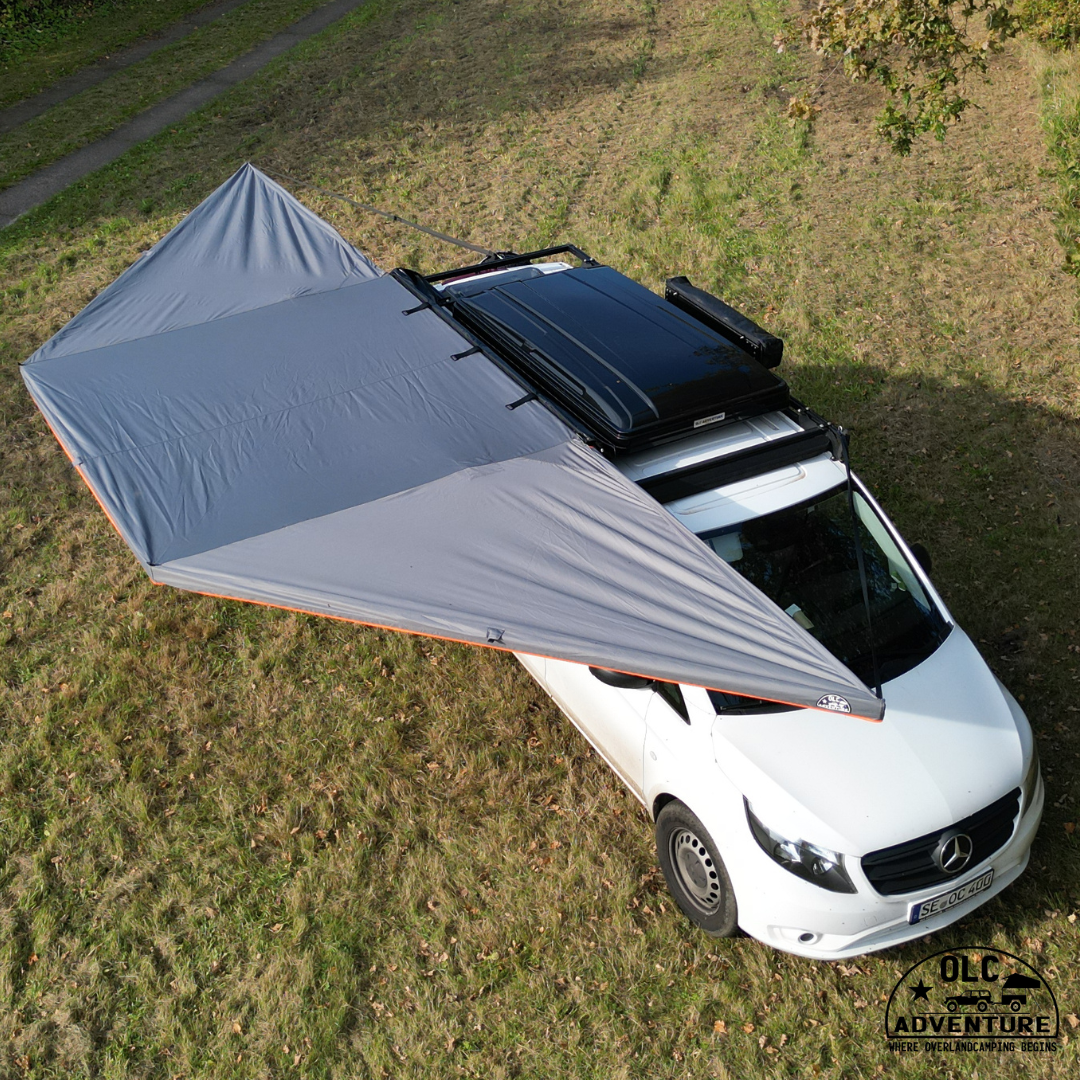 Unsere 180° Markise verfügt in der 2,5 m Variante seitlich am Fahrzeug gute 12,5 m² Schatten und Wetterschutz.