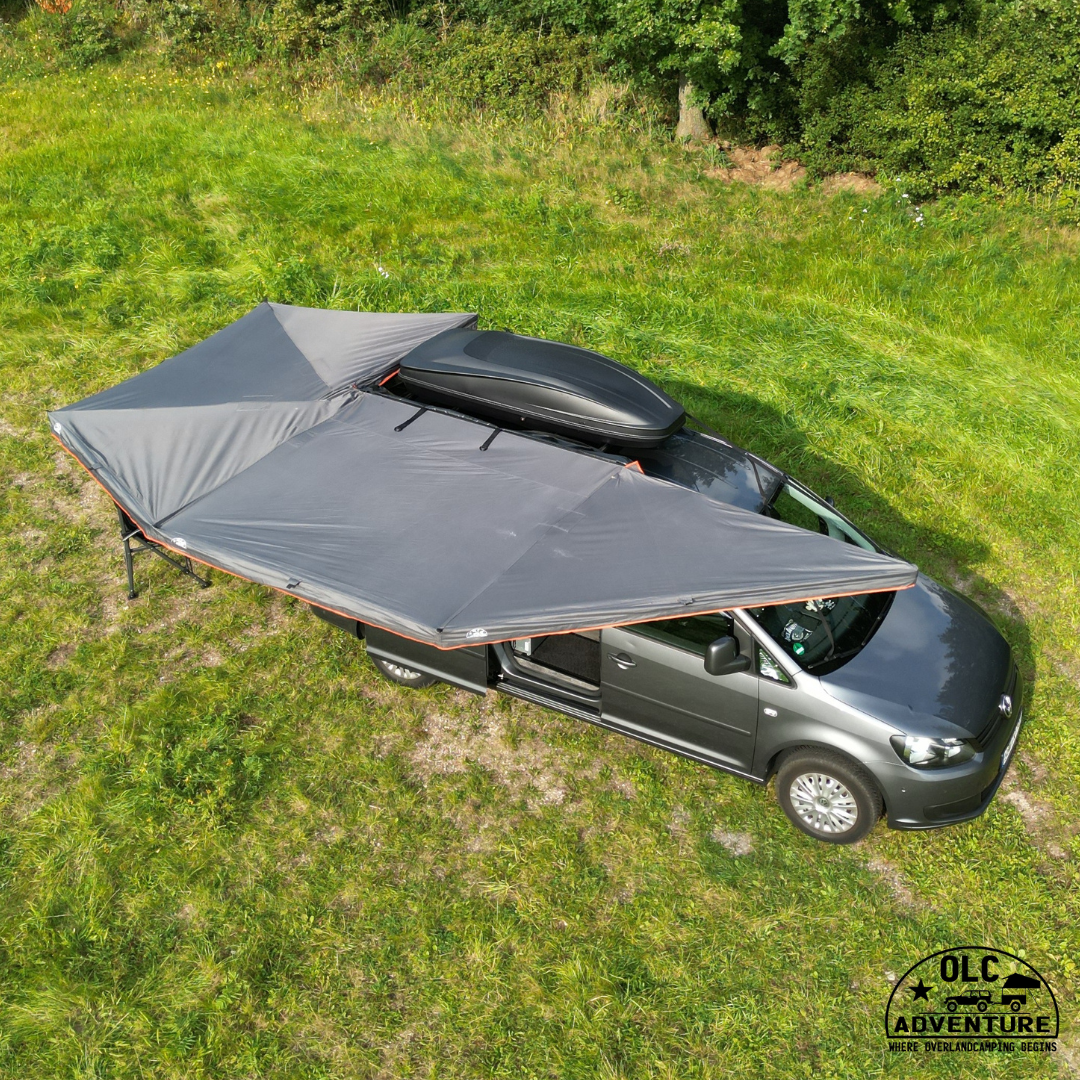 Die freitragende 270° Markise in der Xtended Variante von OLC Adventure ist innerhalb weniger Minuten komplett aufgebaut. Grade für kleinere Camper, SUV´s, Minicamper und Busse mit kurzem Radstand ist diese Größe der beliebten Markise geeignet. Sie zeichnet sich durch eine durchdachte, leichte und trotzdem sehr stabile Konstruktion aus. Jeder Arm der Markise hat seinen eigenen Drehpunkt und ist durch die verschweißte, doppelte 4 Kant-Aluminiumrohr Konstruktion im A-Design enorm belastbar. Kleine Aufsteller auf den Armen geben dem Stoff ein Gefälle, damit Regenwasser gut und gezielt ablaufen kann. Die 3 integrierten Teleskopstützen helfen bei leicht windigem Wetter die Markise am Boden zu befestigen. Sollte es etwas mehr auffrischen, können die 3 übrigen Teleskopstangen im Handumdrehen installiert werden. 6 signalfarbene Abspannbänder und Heringe geben der Markise dabei guten Halt. Zwischen den Armen lässt sich die Markise nochmals abspannen, damit das Regenwasser auch sicher seinen Ablauf hat. Der Stoff besteht aus einem 600D Polyesterstoff, welcher leicht und trotzdem sehr belastbar ist. Er verfügt über einen UV-50 Sonnenschutz, ist tauchimprägniert und von unten PU beschichtet.